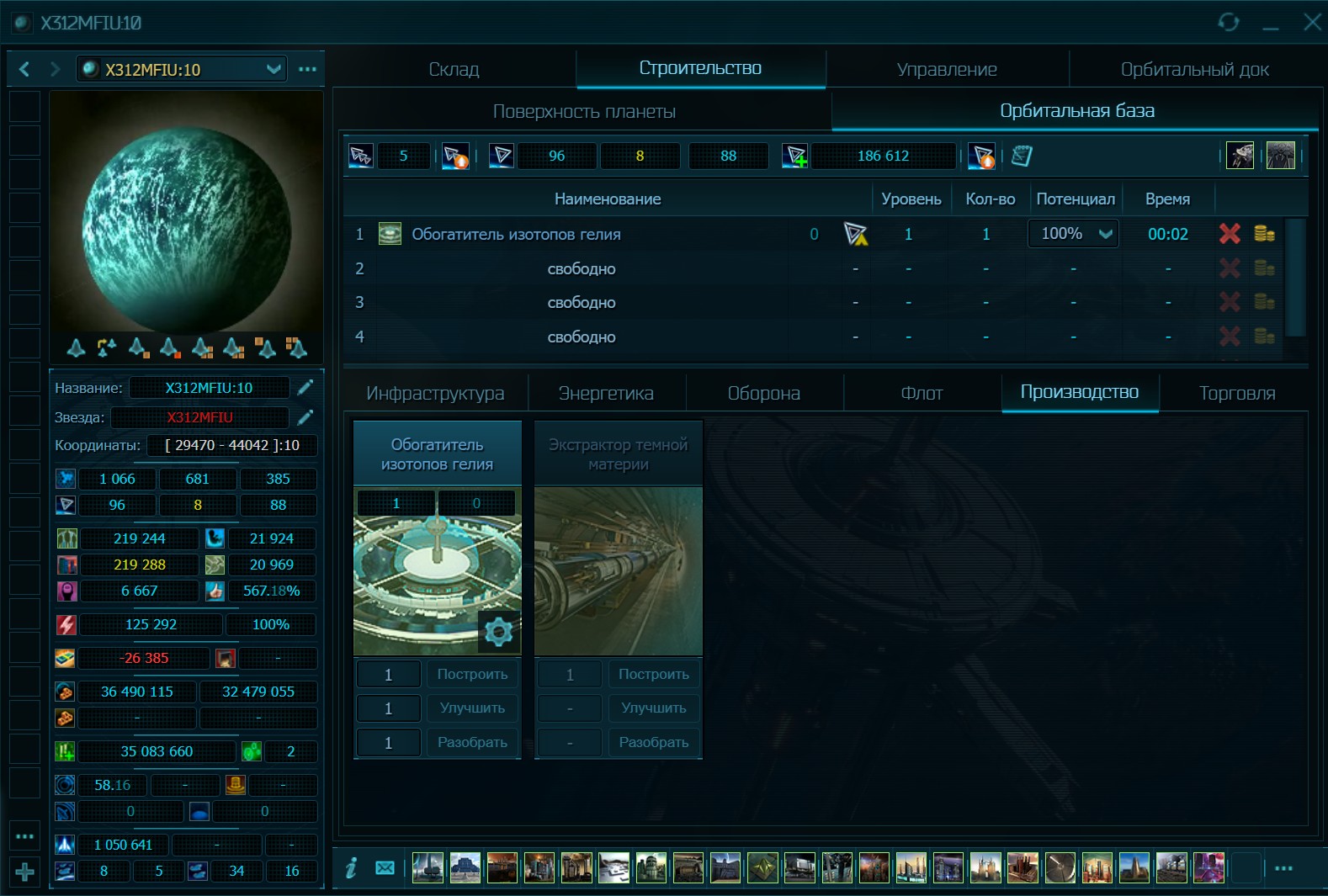Как говорилось выше – экономика здесь весьма сложная, но тем более интересен процесс развития. Здесь нет, как в большинстве игр, 3-4 видов ресурсов. Только топлива для кораблей и электростанций используется 4 вида, а есть ещё 19 видов добываемых ресурсов, из которых производится 13 видов материалов. Большинство ресурсов добывается на планетах и астероидах, но есть уникальные, которые присутствуют исключительно на астероидах или вырабатываются только на орбитальных станциях. Для добычи на астероидах необходимо строить добывающий флот, а для этого необходимы соответствующие исследования, орбитальная станция с командным центром, доком и ангаром. Кстати, ваша первая планета абсолютно неприкосновенная, так же как и её орбитальная станция и все расположенные на её орбите флота. Отличный способ сохранить корабли без необходимости постоянных перелётов.