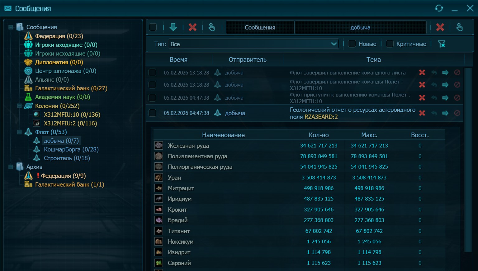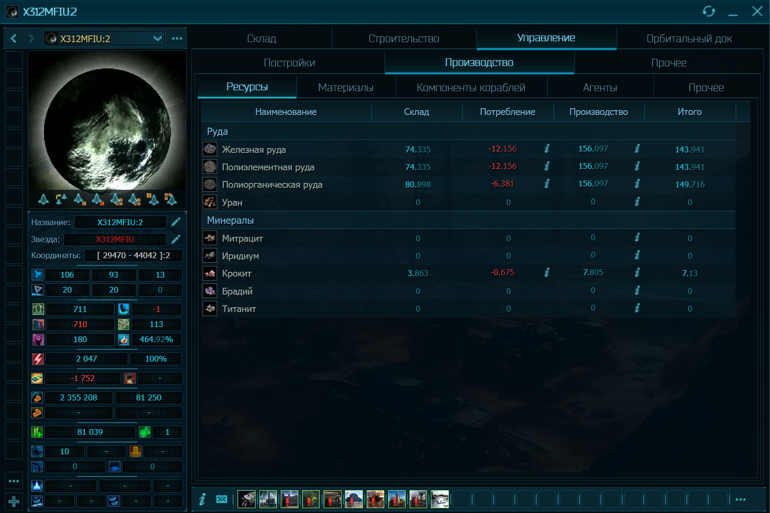 Как говорилось выше – экономика здесь весьма сложная, но тем более интересен процесс развития. Здесь нет, как в большинстве игр, 3-4 видов ресурсов. Только топлива для кораблей и электростанций используется 4 вида, а есть ещё 19 видов добываемых ресурсов, из которых производится 13 видов материалов. Большинство ресурсов добывается на планетах и астероидах, но есть уникальные, которые присутствуют исключительно на астероидах или вырабатываются только на орбитальных станциях. Для добычи на астероидах необходимо строить добывающий флот, а для этого необходимы соответствующие исследования, орбитальная станция с командным центром, доком и ангаром. Кстати, ваша первая планета абсолютно неприкосновенная, так же как и её орбитальная станция и все расположенные на её орбите флота. Отличный способ сохранить корабли без необходимости постоянных перелётов.