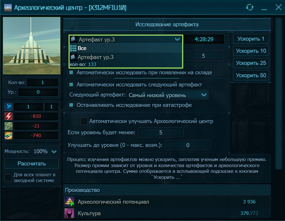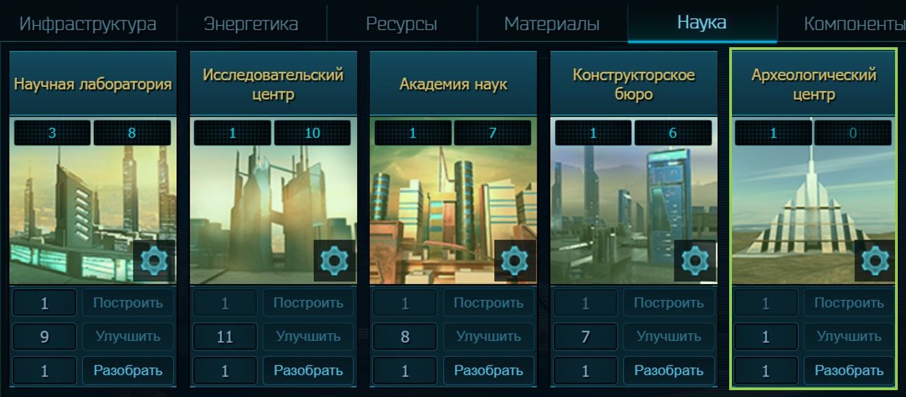 И, наконец, о науке. Исследования не ограничены уровнями и не требуют расхода материалов. Необходимы только научные здания, скромно потребляющие энергию и кредиты на содержание. Здания вырабатывают научный потенциал и добавляют количество очередей, которые идут в общую казну вашей империи. Соответственно, исследования не привязаны к ресурсам отдельной планеты, что является огромным плюсом. То же самое касается и проектного потенциала, вырабатываемого Конструкторскими бюро. Он необходим для проектирования кораблей. Третий потенциал – археологический. Он зависит от уровня планетарного Археологического центра, в котором исследуется конкретный артефакт.